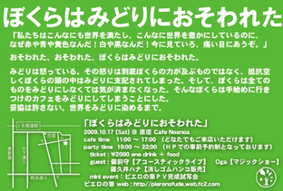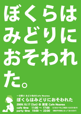 「一日だけカフェをやるとしたら、どんなお店にする?」 ぼくらは行きつけのカフェを緑色に染めてしまうことにした。お店も料理もぼくたちもお客さんも、全てをみどりに染めた一日。おそわれた。おそわれた。ぼくらはみどりにそめられた。