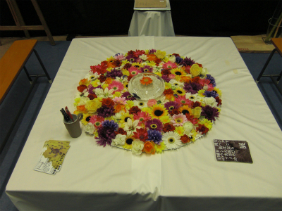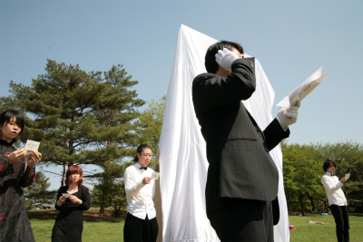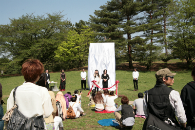 特大の顔出しパネルを制作&原っぱに設置。ピエロの筆始まって以来、最大のバカバカしさを誇る開会式典が厳粛にとり行われた。参加者を気まずさのドン底に誘い込み、一般ギャラリーを一瞬で追い払った「讃美歌斉唱」や、中身のない来賓祝辞。メンバーを含め会場にいる全員が嫌な汗をかいた、色んな意味で「やりすぎ」な企画となった。今まで、かかわってきた人や、新しく知り合った人。多くの人に「ありがとう」が言いたいよねってことで、起き上がったこの作品企画、新しい挑戦だった。