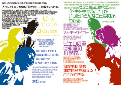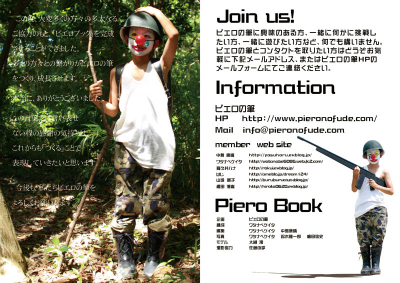 頼まれていもいないのに、半年間もの時間をかけて全力を出し切って制作した、ピエロの筆によるピエロの筆のための、ピエロの筆紹介冊子。「生きることはつくること」「誰もが今日をつくる」「本当の作品とはあなた自身。」決してぶれない一貫したテーマと、本当のことばたち。メンバーの「生きる」を詰め込んだ24ページ。