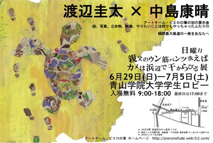 中島康晴と渡辺圭太が作品を作りまくった展覧会。会場からストップがかかったにもかかわらず、この展覧会タイトルで押し切り、看板にブリーフまでぶら下げた企画。